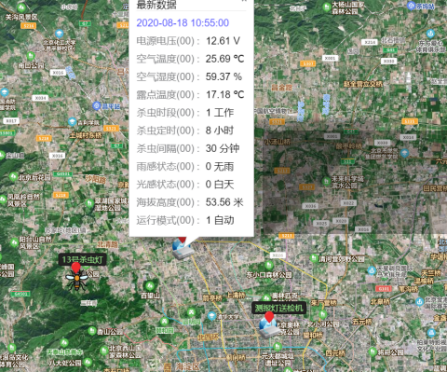 利用害蟲趨光、趨波、趨色、趨性信息的特性,將光的波長、波段、波的頻率設定在特定范圍內,近距離用光、遠距離用波,或者采用性誘劑產生的性信息引誘成蟲撲燈,燈外配以頻振式高壓電網觸殺,使害蟲落入燈下的接蟲袋或集蟲倉內。可擴展接入防治區域氣象環境參數和拍照圖片上傳,遠程掌握該區域對防治蟲害的運動時間范圍軌跡,同時可和圖片分析蟲害的分類等數據比對。