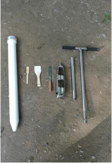 a. 取土鉆鉆頭、手柄、支桿,完成后將取土鉆豎直于地面,雙手緊握手柄順時針下壓慢速轉動。(注意:不要太用力,務必慢速多轉幾圈,防止鉆頭跑偏至孔洞打歪)