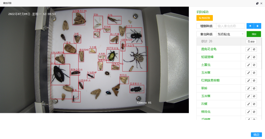 (1)自動(dòng)識(shí)別。使用本公司《人工AI智能蟲體識(shí)別系統(tǒng)》V3.0自動(dòng)識(shí)別蟲體照片中的害蟲種類同時(shí)計(jì)數(shù)。