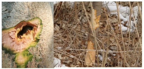 樹木主干樹皮,枝干嫩皮,影響樹木生長,中度或重度危害啃食樹皮造成封閉或半封閉樹皮環剝,導致幼樹死亡,人工林面積越大,鼠害發生越嚴重。